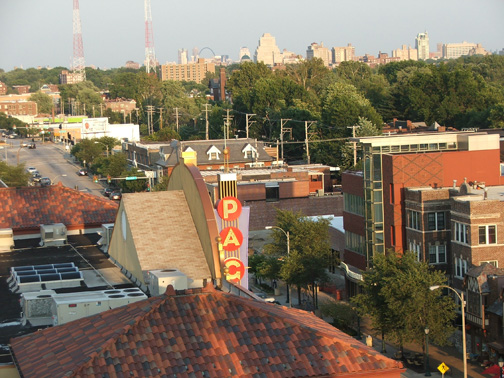 Rooftop terrace view. St. Louis skyline with the arch.