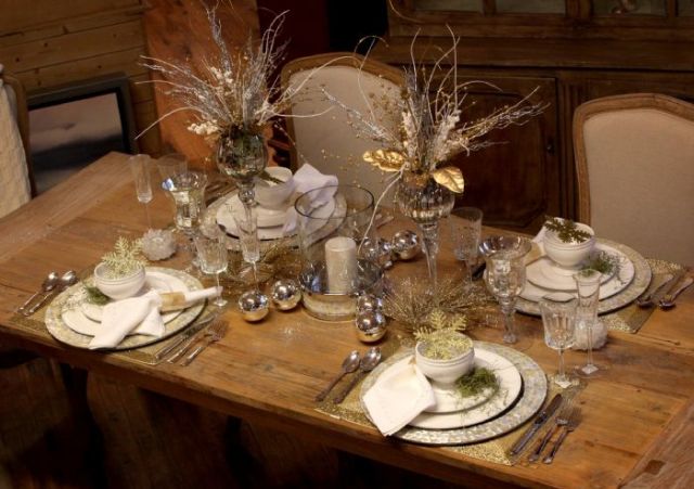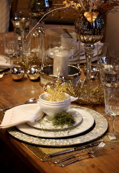 Here is a fun glam tablescape mixing natural elements with glitzy. Fun for a New Years party .