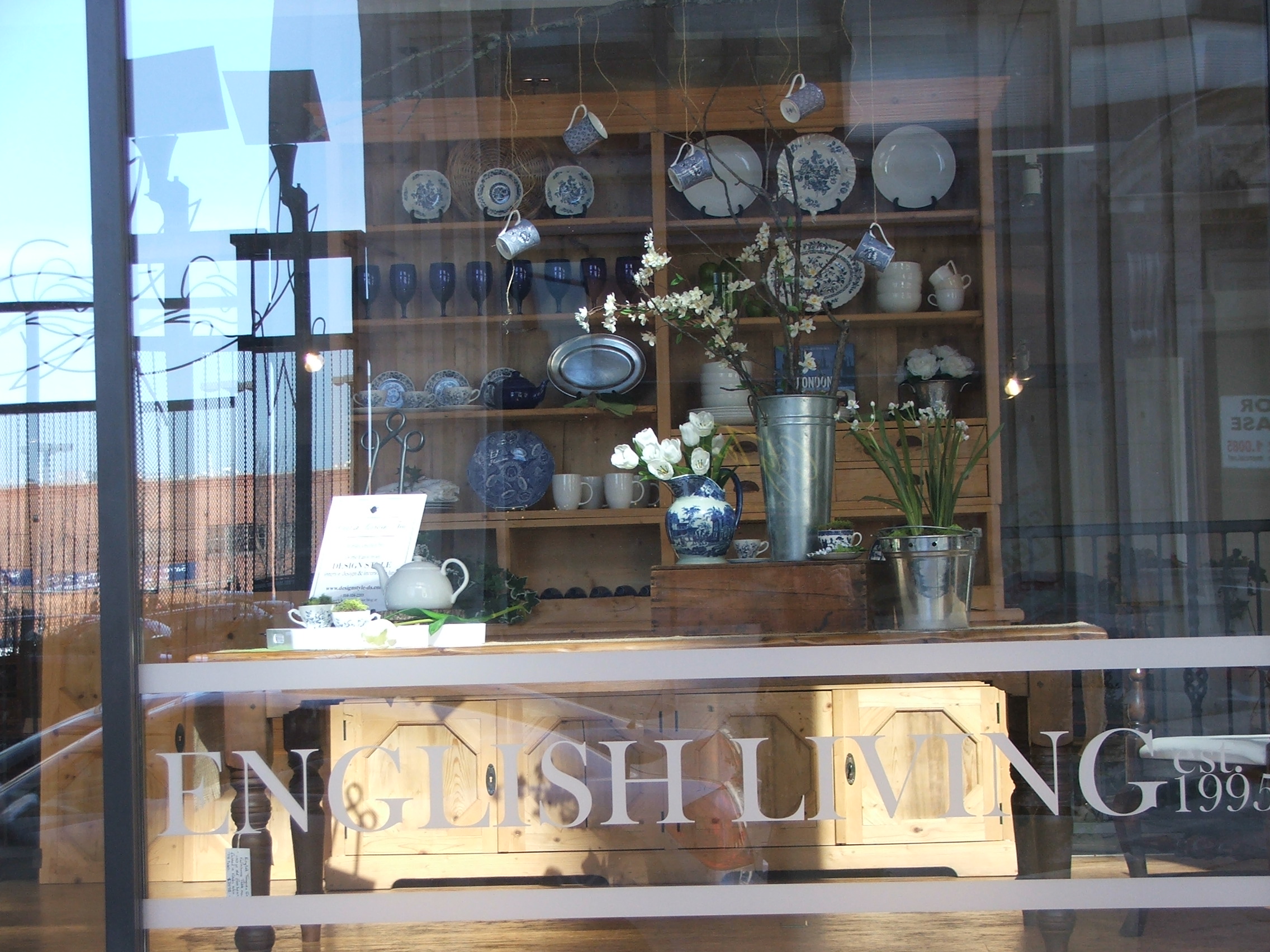 We have a fine English furniture store here in St. Louis Missouri called English Living, located at 1520 Washington Street where they bring antique and reproduction furniture over from England and Europe to our fair city. I just designed a window display for an English Garden Tea there. Since the London Tea Room is just next door I thought I would incorporate a tea theme into my display and since Spring is just around the corner, add a little garden touch. I wish St. Louis had more window displays like they use to, like back in the good old days. Add your comment and let us know what you think and stop in the tea room for a spot of tea, Love.