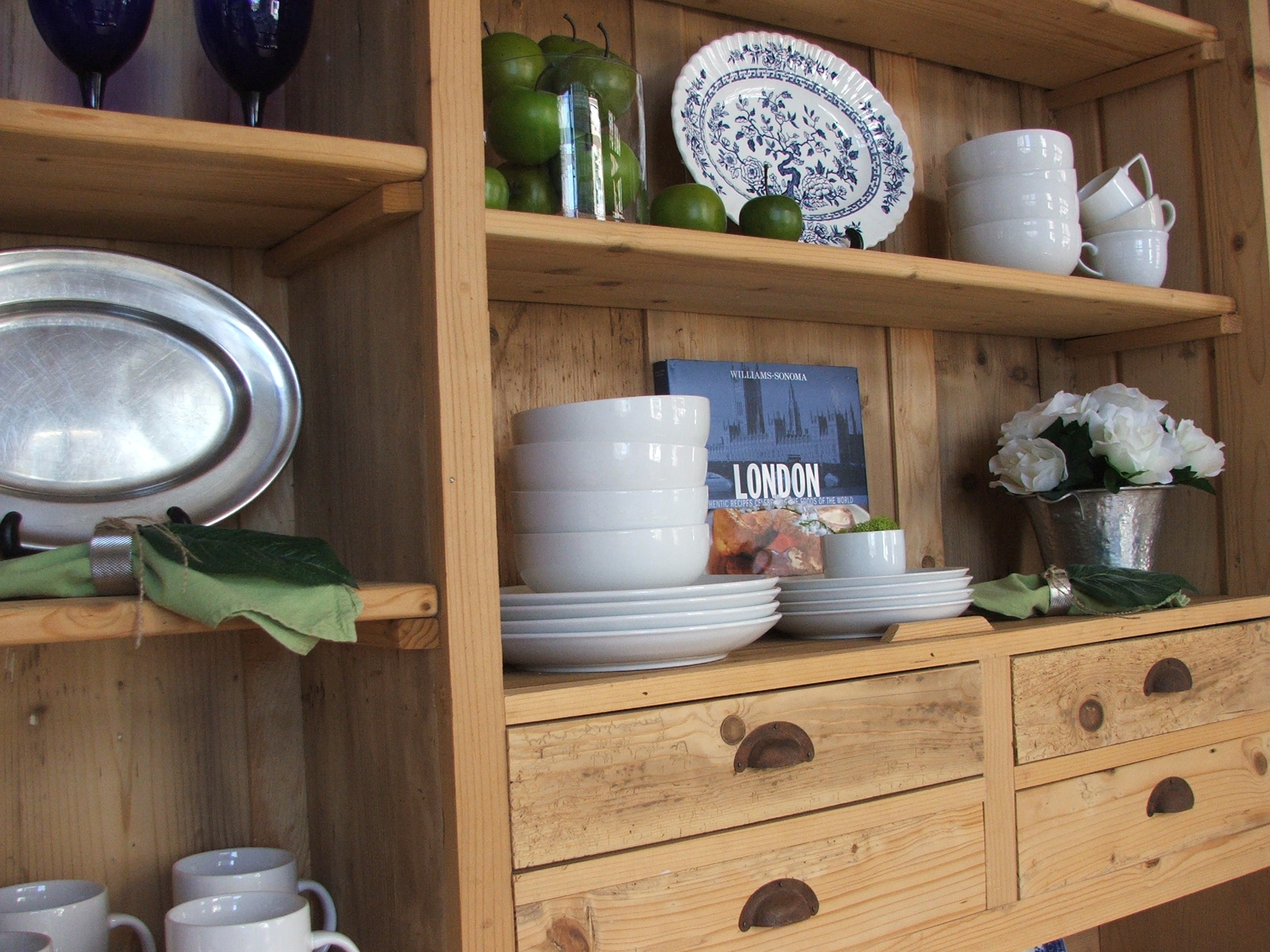 I used a lovely handcrafted table made from old english pine and a great raw pine hutch. Which I “dressed”, as they say, in traditional blue and white and plain white china. I suspended cups from a tree branch with sisal rope, for a bit of whimsy.
