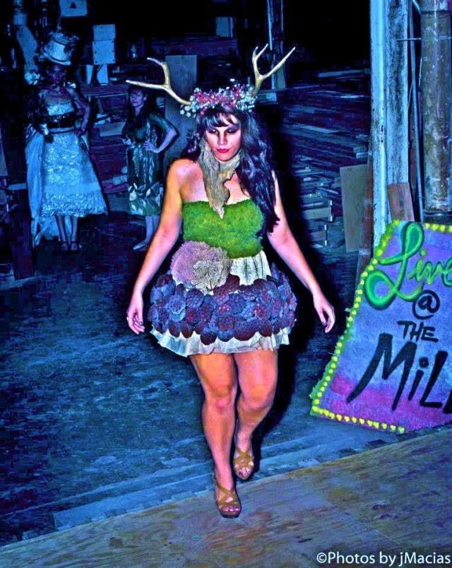 This is one of my daughter Jessi’s designs using lotus pods and a moss bustier and antlers from the Good Will. I think her model looks great and the photo is very cool.