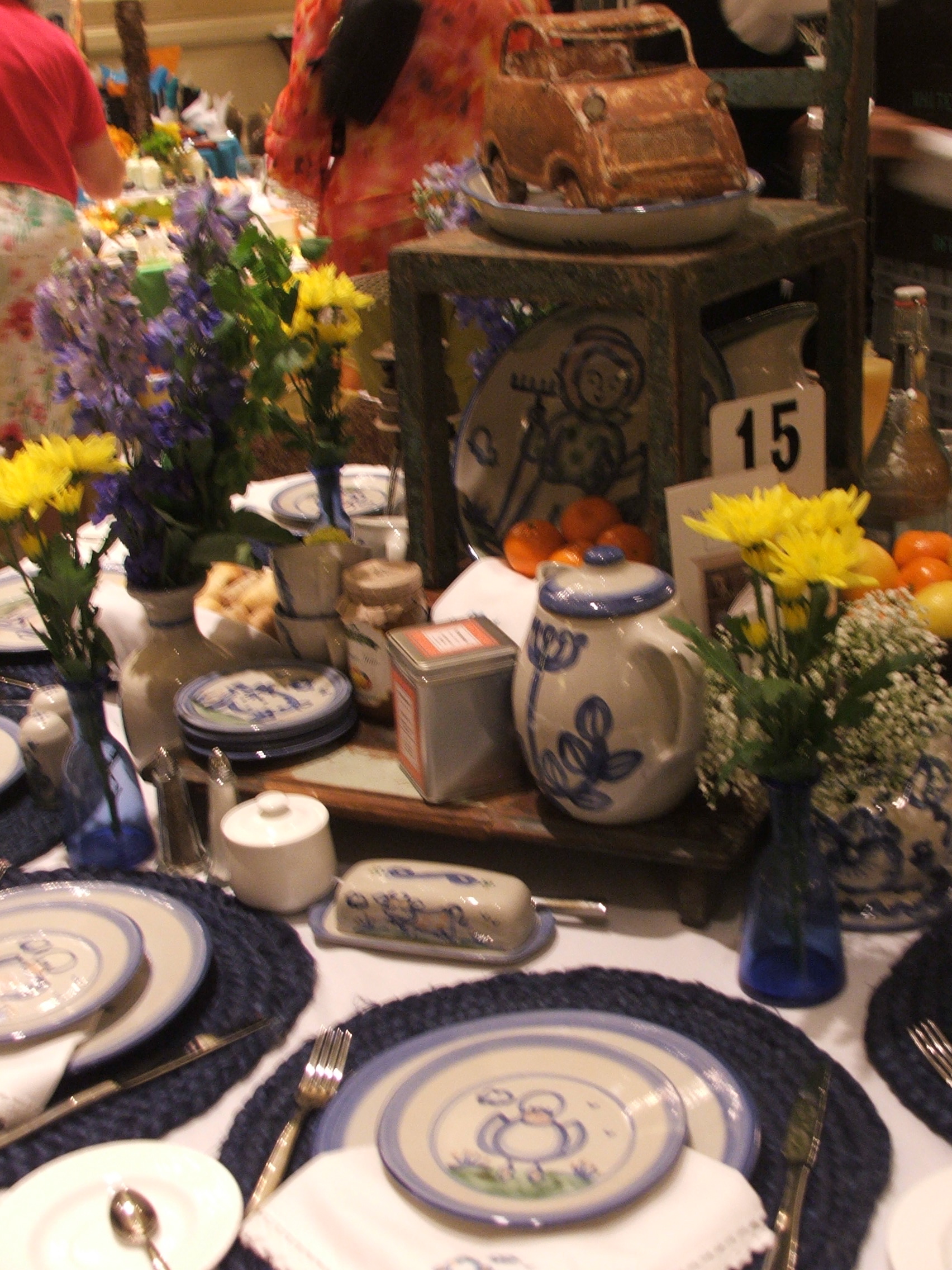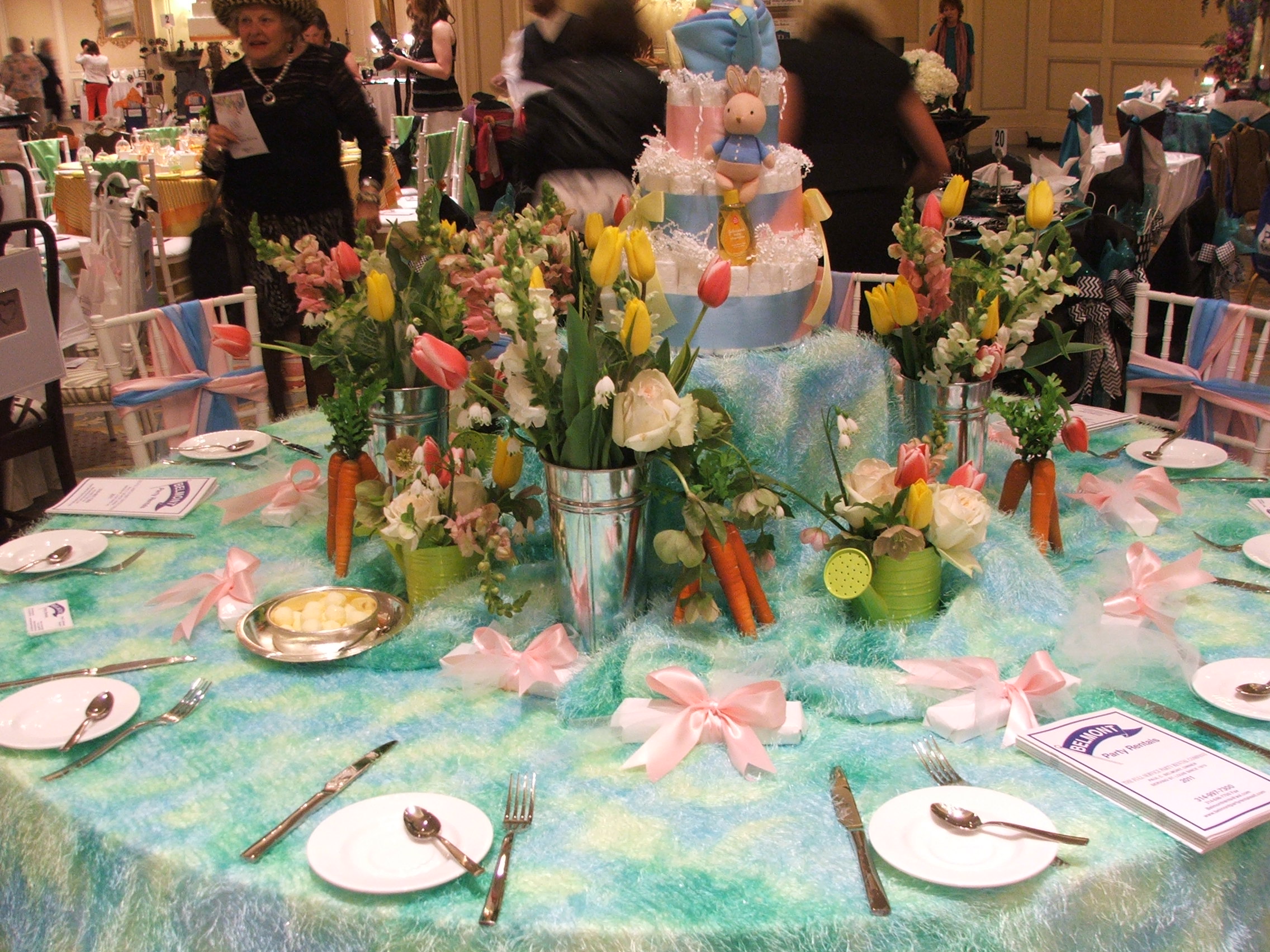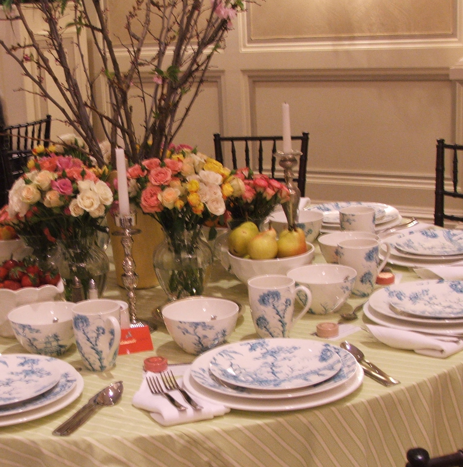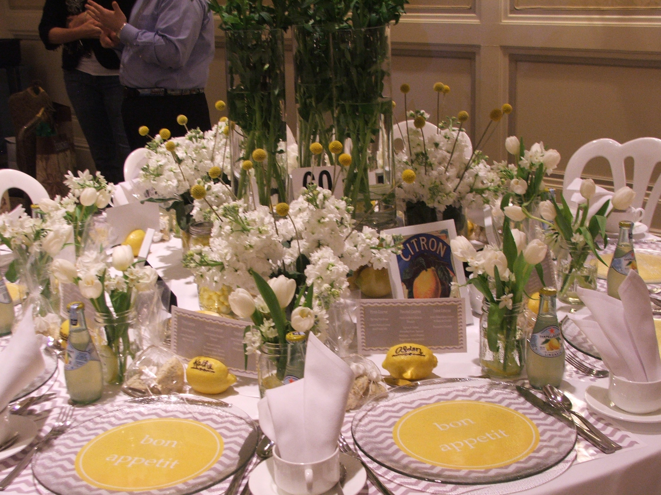 My table design was a simple, natural, classic design. I chose to use a burlap table overlay over a white table skirt. I used an old wooden box with a great patina for the center and set a glass vase with white cherry blossoms mixed with twigs on top. I choose white tulips with burlap overlays as my gift for my guest who sat at my table. For the place settings I used Italian Pewter chargers from Williams Sonoma and white dinnerware in the Gabriella pattern from Pottery Barn. The napkins were in a french stripe and I tucked a sprig of fresh rosemary under each silver napkin ring. I added moss and birds nest and some live greenery in mercury glass containers. It was a lot of fun and I had some lovely ladies at my table.