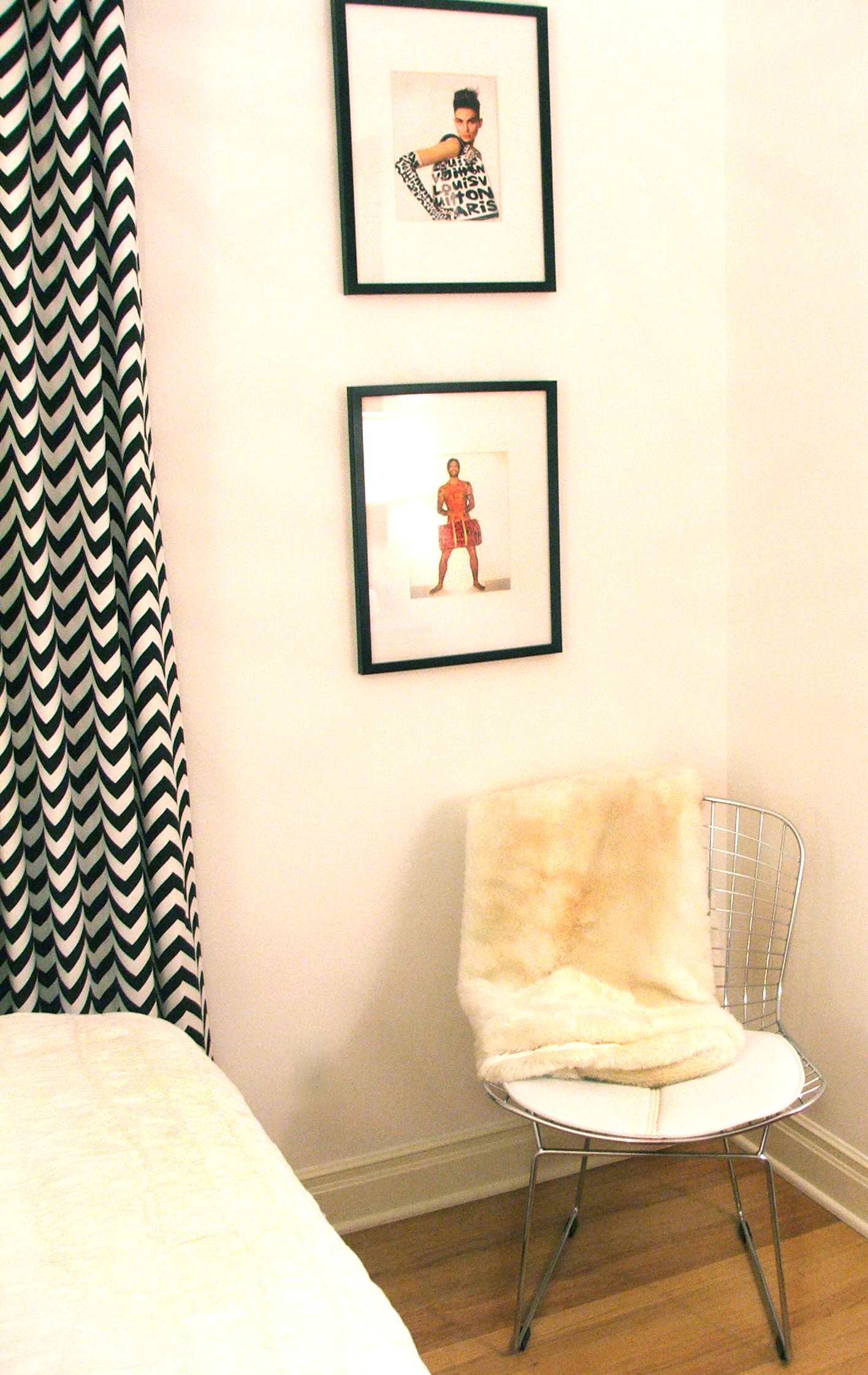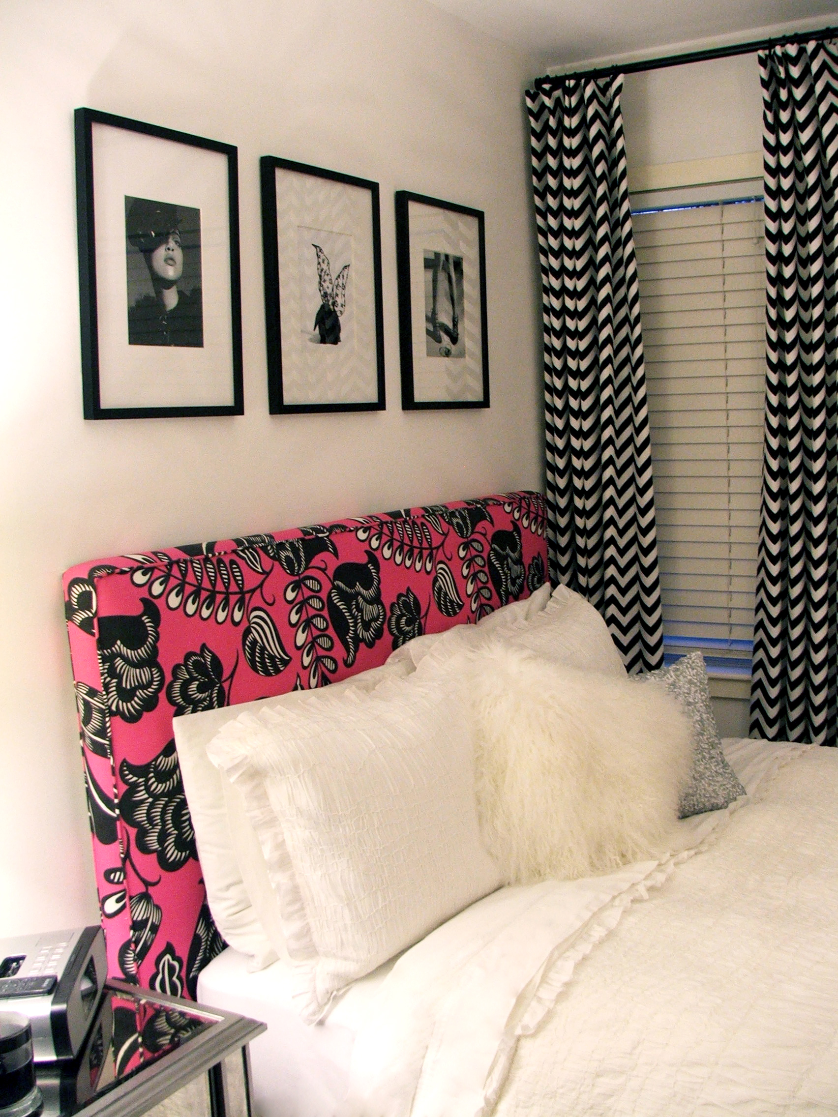 Another thing to keep in mind is scale. Even though this was a small room I used a fun and funky light fixture that was large in scale. I kept the walls neutral and added graphic element’s like the black and white Chevron drapery panels and the head-board made in Designer Guilds Coconut Grove pattern. I used a large-scale mirror to help reflect light and add visual space. The night stand was mirrored so it added reflective space. The wire chair since it was light and airy didn’t use much visual space. The dresser was also large in scale and was the clients and they had wanted to keep it and I thought we could make it work. So, it was painted and some new mercury glass knobs were added from Anthropologie.