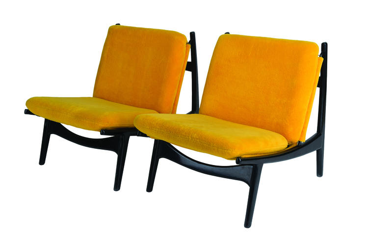 These arm chairs in lemon with black stained wood by Joseph André Motte, circa 1950, offered by Galerie Patrick Gutknecht would look great in our mountain view living room.